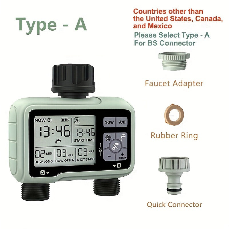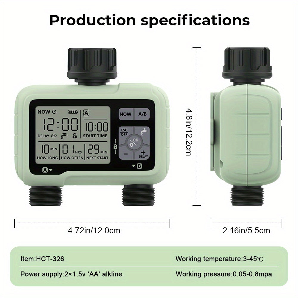 Take the guesswork out of garden care with the NNETM Dual-Outlet Water Timer. Designed for outdoor irrigation systems, this smart timer lets you precisely control two zones with separate schedules. It’s fully adjustable, allowing you to tailor your watering to the needs of different plants or areas. With a compact design measuring approximately 12 x 12.3 x 5.5 cm (refer to the image), installation is quick and easy with standard 3/4” fittings. Ideal for busy gardeners, this timer helps save time, effort, and water.